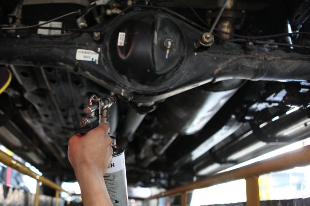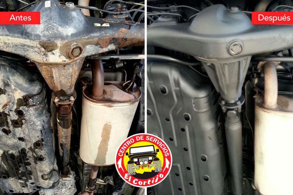 Lavado y desengrase de la parte baja; además, lijamos el óxido y de ser necesario esmerilamos y aplicamos un removedor de óxido, antes de sellar el undercoating wurth.